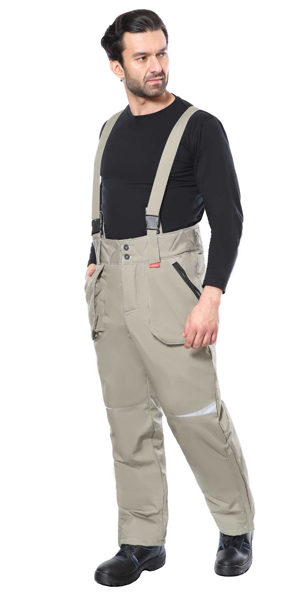 Костюм для работы в зимнее время на открытом воздухе. Ткань с водоотталкивающими свойствами. Куртка короткая с эластичной вставкой в нижней части. Манжеты тоже эластичные в форме напульсников, благодаря чему куртка не продувается через рукава и внутрь не попадает снег во время активной работы. Основная застёжка – молния. Дополнительно куртка запахивается на застёжки-липучки. Капюшон съёмный, регулируется по объёму. Воротник-стойка. На груди имеются накладные прямые карманы с клапанами, застёгивающимися на липучки. По бокам – косые открытые карманы. Полукомбинезон на эластичных бретелях с регулировкой по длине. Центральная застёжка – молния.
